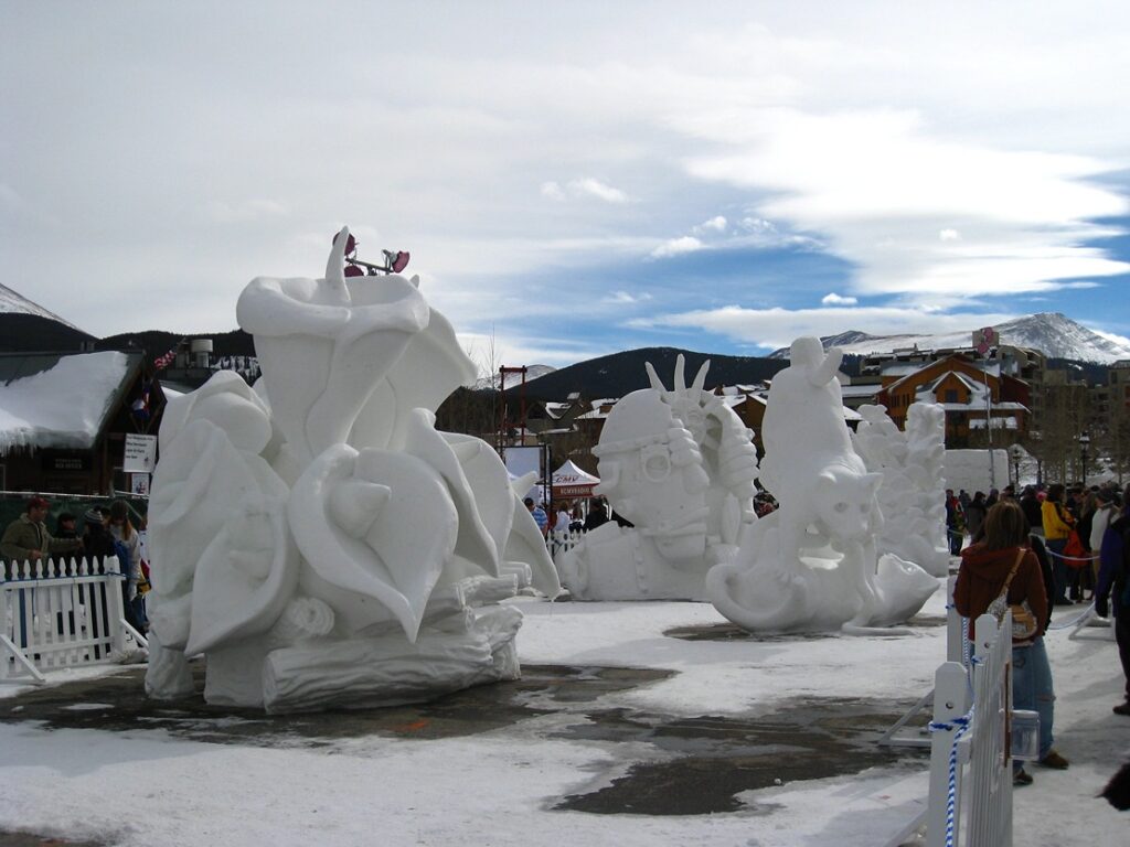Breckenridge’s International Snow Sculpture Championships epitomize the town’s fusion of artistic flair and winter revelry. This annual spectacle transforms the streets into an open-air gallery of intricate, ephemeral snow sculptures. Visitors are captivated by the artists’ skill, turning massive snow blocks into awe-inspiring creations that tell unique stories in the delicate medium of snow. In fact, while the official viewing takes place a week after the sculpting, the watching the sculptors work is a fascinating spectacle in itself!